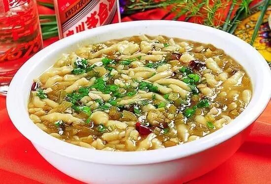 浆水鱼鱼是一道著名的陕西传统小吃。浆水鱼鱼曰鱼,其实并不似鱼,酷如蝌蚪。外地人多不知做法,秦人有戏谑者夸口为手工一一捏制,遂使外人叹为观止。