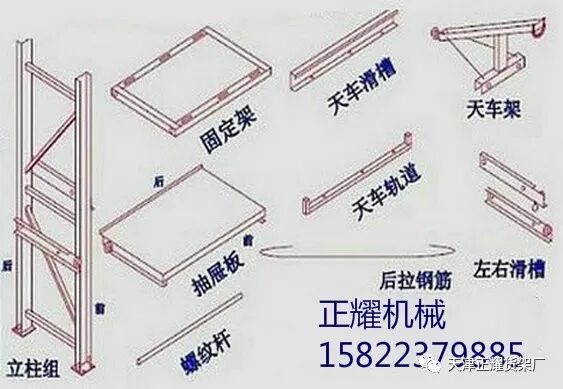 7、模架抽板承载后轻松抽送,上下间隔随意调整,协同备有的滑车和手动葫芦可轻松、快捷的完成存取工作;