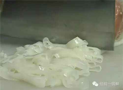 1 将凉皮叠好,切成米粉粗细的长条,装入碗里。