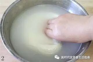 2.盆里加入足够的清水,把面团慢慢放在水里揉捏。