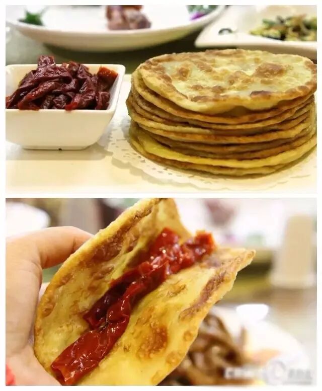 油饼卷辣子,这个重点推荐,油饼是煎烙出来的,辣子是新鲜秦椒卤煮过的,味道鲜辣微酸,和油饼卷在一起吃,真是绝配。