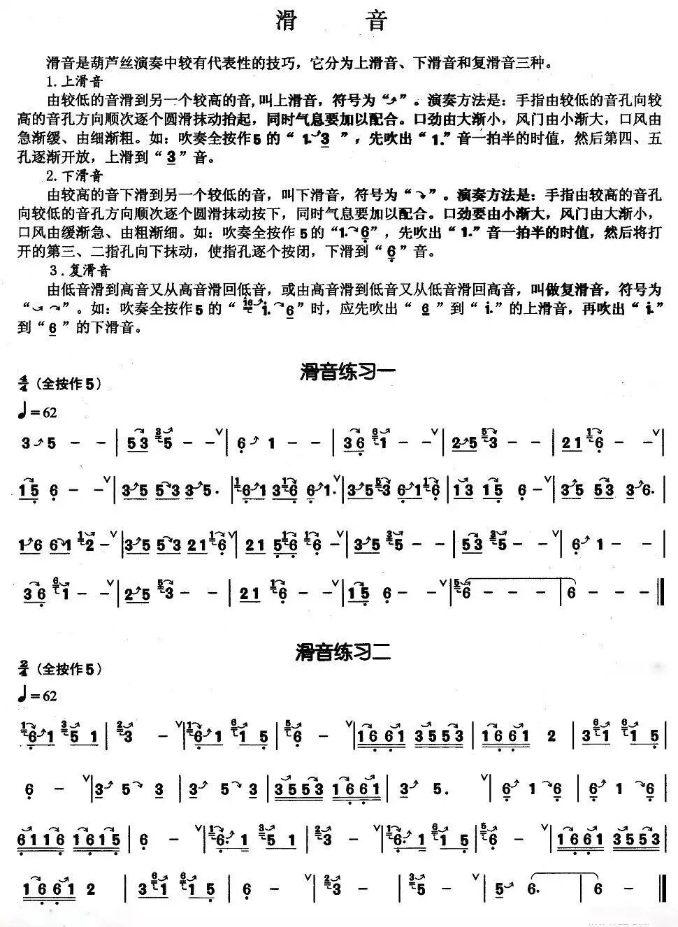 上滑音: 低音6到1的上滑音为右手食指和中指一齐向上45度角的方向推抹后抬指并回环到原位上空,。在推抹过程中气息逐渐减弱; 1到2的上滑音为左手无名指弯第一关节逐渐往后拉抹后抬指; 2到3的上滑音为左手中指弯第一关节逐渐向左上方拉抹全孔后抬指;3到5的上滑音为左手食指向垂直方向挑抹全孔后回环到原们上空;5到6的上滑音为左手大拇指向左横抹全孔后抬指。