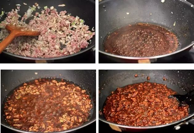 2.葱姜末爆锅,下肉馅炒至变色,加入酱料炒香~
