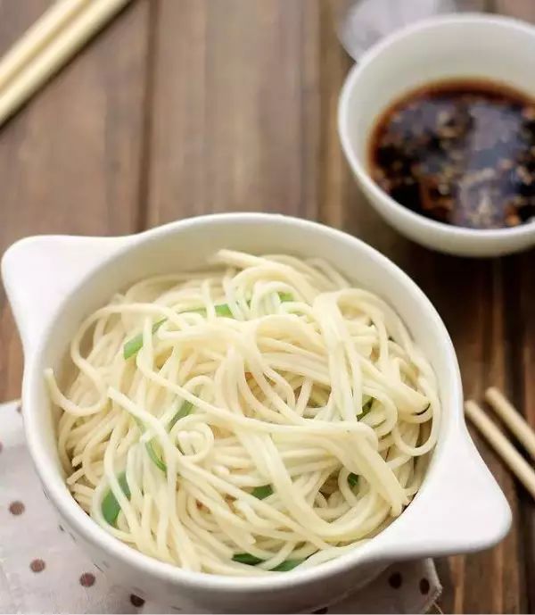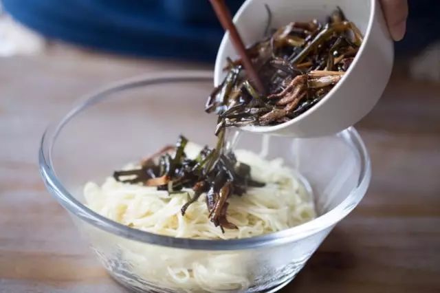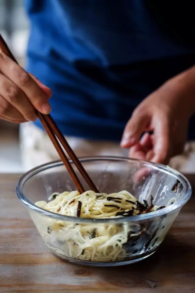 ▼面煮好过凉水后,迅速拌入糖、盐、酱油