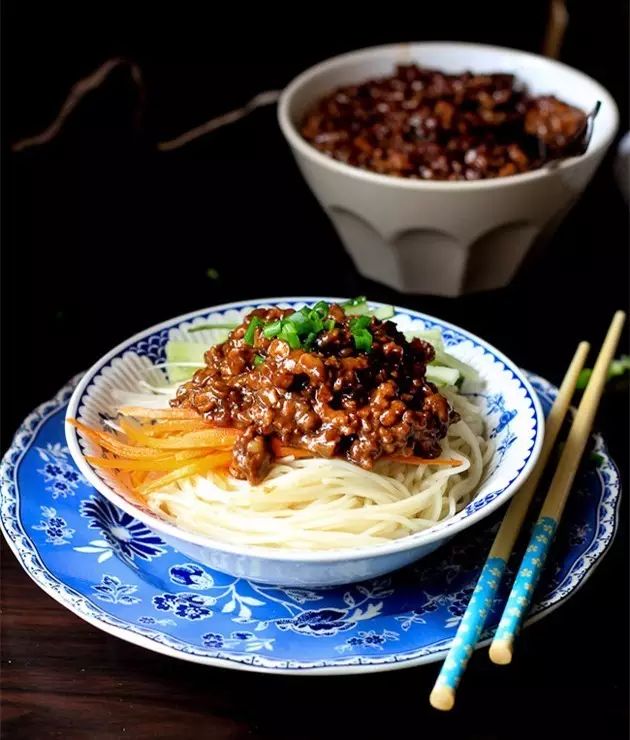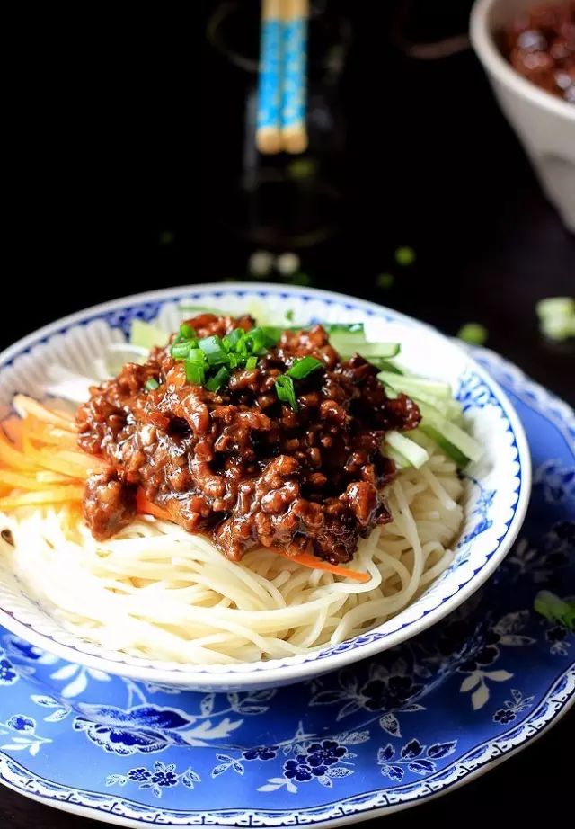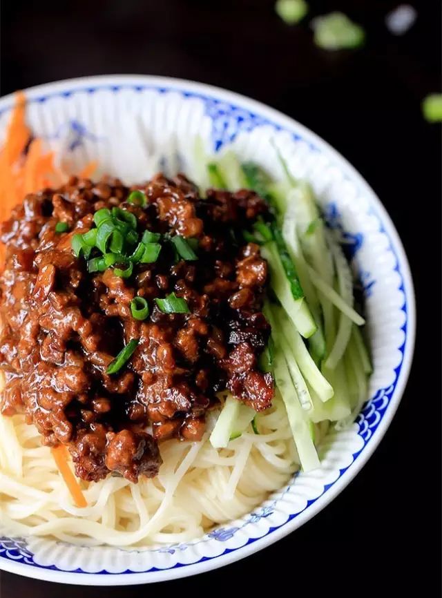 材料 :面条、猪肉末、甜面酱、黄豆酱、黄瓜、胡萝卜、葱花、姜末、香菜。