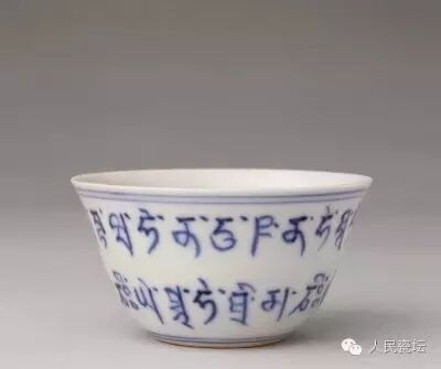 杯浅式敞口,斜腹,内凹足。外口饰青花弦纹2道,腹部以青料书写梵文两周,足底双方栏内双行楷书“大明成化年制”六字款。