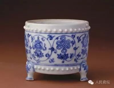 炉呈鼓式,直腹,下承三蹄形足。口及足边分别饰一周鼓钉纹,腹部为青花缠枝莲托八宝纹。。