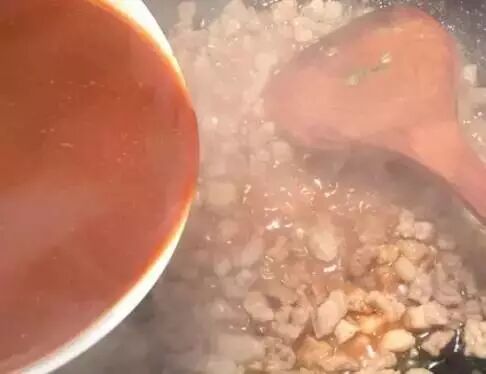 3、肉变色后,列入调好的黄豆酱和白糖,再列入过量的水,吞没住肉,搅拌匀称,中小火焖煮一会。或者煮20分钟,期间可以时不时用铲子搅拌一下,抗御糊锅。煮好后,放入葱花拌匀,把炸酱盛出备用。