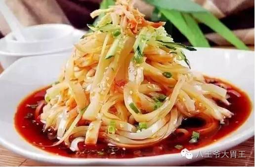 凉皮是西安当地的名吃,凉皮的做法也多样,其中尤以秦镇凉皮最为有名,至今已有2000余年历史,调好的凉皮全呈红色,辣里透香,味道爽口,顺滑Q弹,备受食客喜爱。
