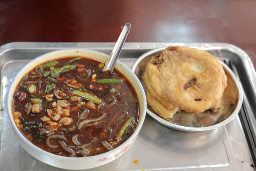 外焦里嫩的锅魁,它的外皮已经被煎烤成金黄色了,闻起来很香,咬上去一口,脆皮已经酥得掉渣了;