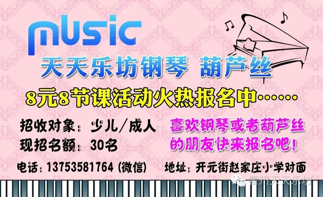 天天乐坊 钢琴 葫芦丝 8元/8节课活动开始了!