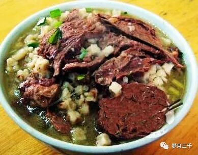 6.加入食盐,白胡椒粉,再放入粉丝,以及撕好的适量羊肉块儿,一起再次煮沸后,马上倒入碗内,最后撒上香菜末,葱花,青蒜等,加入用手掰好的馍粒儿,喜欢辣的就放点辣子,若有糖蒜就一定配着吃。