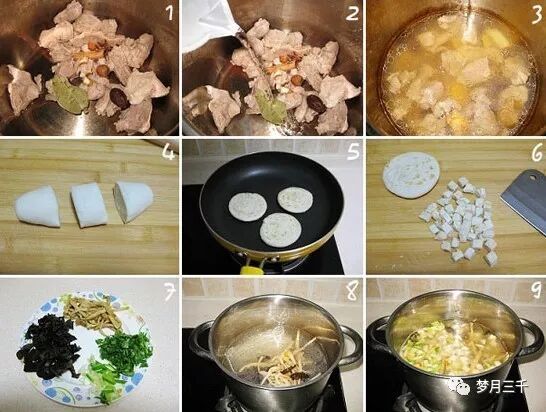 5. 舀适量羊肉汤入锅,放入切好的白萝卜片,黑木耳丝烧开;