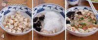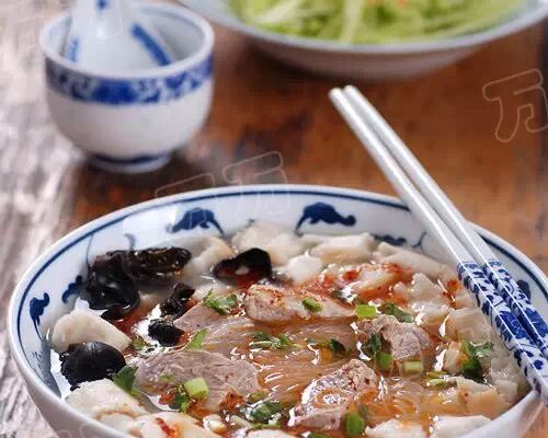 6. 馍掰碎成约小指尖大小的小粒,放在碗里,粉丝,木耳过水焯熟,放入碗中,浇上热的纯羊汤,撒盐和白胡椒粉,上面放切块的羊肉,撒切碎的青蒜香菜,浇上辣椒酱或者辣椒油即可。