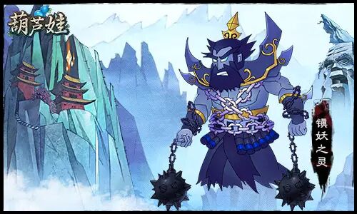 镇妖之灵真身乃地狱主宰阎王化身而成,其掌管着世人的生死轮回,判定生前功过,并加以赏罚,此次分出一缕神魂化身为镇妖之灵来帮助葫芦兄弟,只因蛇蝎二妖作恶葫芦山,无数无辜生灵惨死,进入地狱不得轮回,所以选择了同样刚正不阿的大娃,为其涨势,共同面对众妖精。