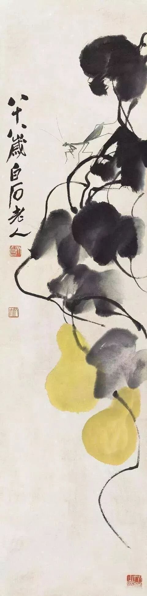 葫芦题材,为受众所喜闻乐见,雅俗共赏,因此,作为一个接地气的职业画家,和常以普通民众所欣赏的题材入画的花鸟画家,齐白石自然对葫芦题材情有独钟。
