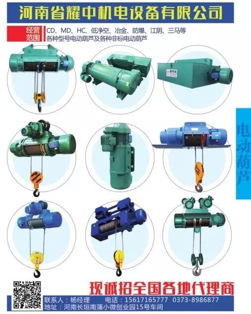 河南省耀中机电设备有限公司公司产品有:0.25T-100TCD型、MD型、HC型、冶金、防爆、低净空、超高型后驱动、曲线轨道、欧式等各种型号电动葫芦及配件。0.2KW-18.5KW锥形电机、软启动电机、变频电机、三合一电机、欧式起重电机等各种型号电机及配件,是目前同行业中科技含量高、制造工艺先进、设备精良、技术和经济实力强的企业之一。