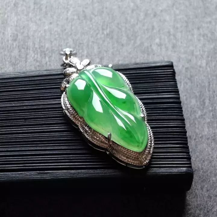 14.18k金镶钻冰种阳绿翡翠叶子吊坠