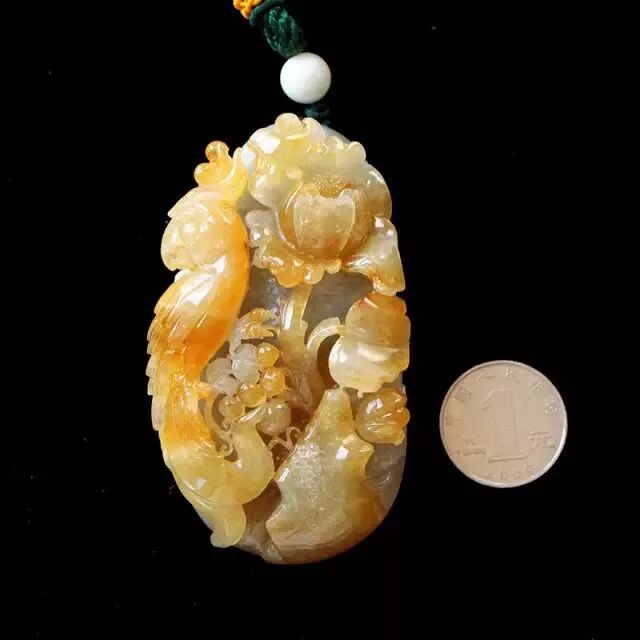 37.精雕冰糯种黄色鸟语花香翡翠手把件