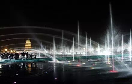 那里有亚洲最大的音乐、灯光喷泉,气势宏伟,如果碰巧音乐喷泉开始时正好在大雁塔上,站在塔顶上看一览无余,比在广场上挤在人堆里看清楚、舒服多了。还有错落有致的仿唐建筑群,让人联想到盛唐时期的长安城。