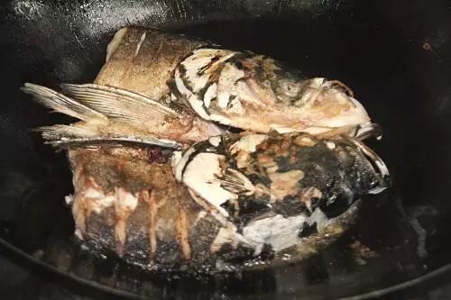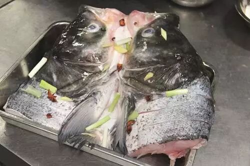 提出一点建议:煎制鱼头前,鱼头不需要拍粉,否则炖制后的鱼头表面不光滑,好像有层薄薄的糊一样,光泽度不好。