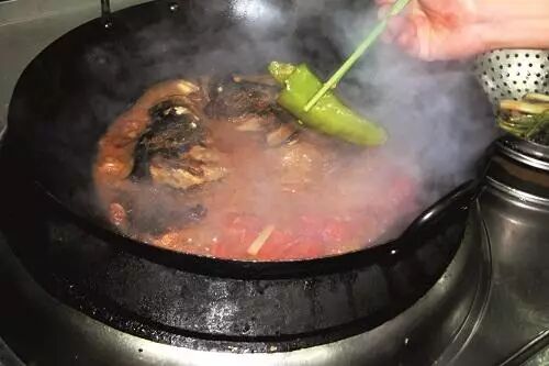 今天李总,跟大家分享他的经典之作“开门红鱼头泡饼”,跟传统的鱼头泡饼在调味方式上有一些不同。首先,使用了自制的香料油,它是用大豆油、花生油、熟猪油熬制而成的,香味特别浓郁。其次,制作的鱼头酱跟北京厨师制作的做法不同。最后,炖制鱼头的过程中,我们还加入了适量的西红柿,一来它可以调节菜肴的口味,二来调节汤的颜色,三来可以遮盖鱼头的腥味,四是可以让食客吃鱼头时不会有丝毫的油腻感