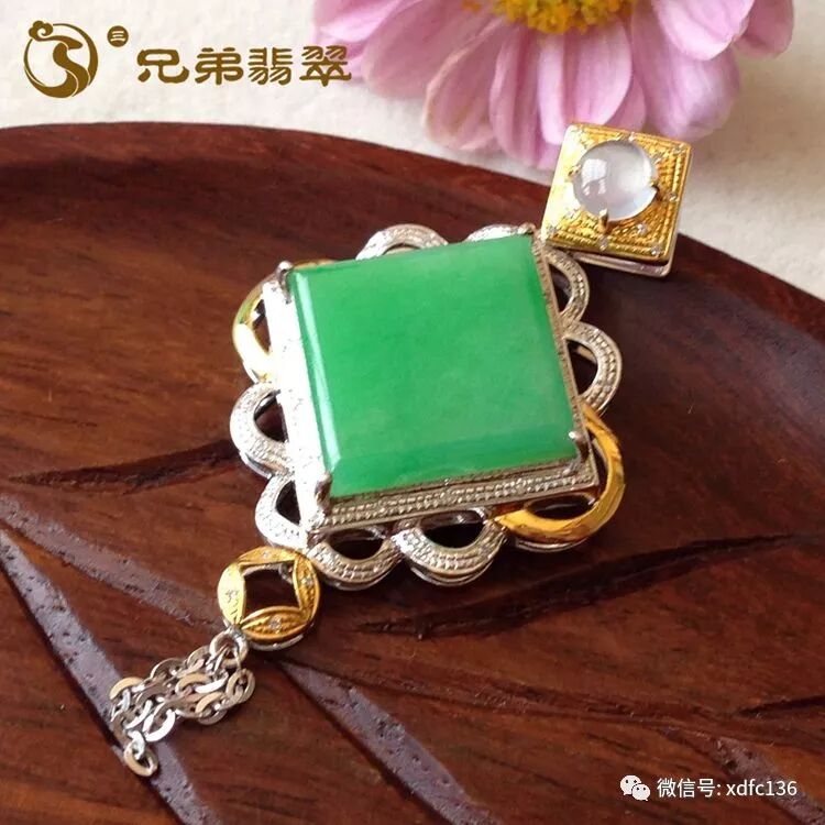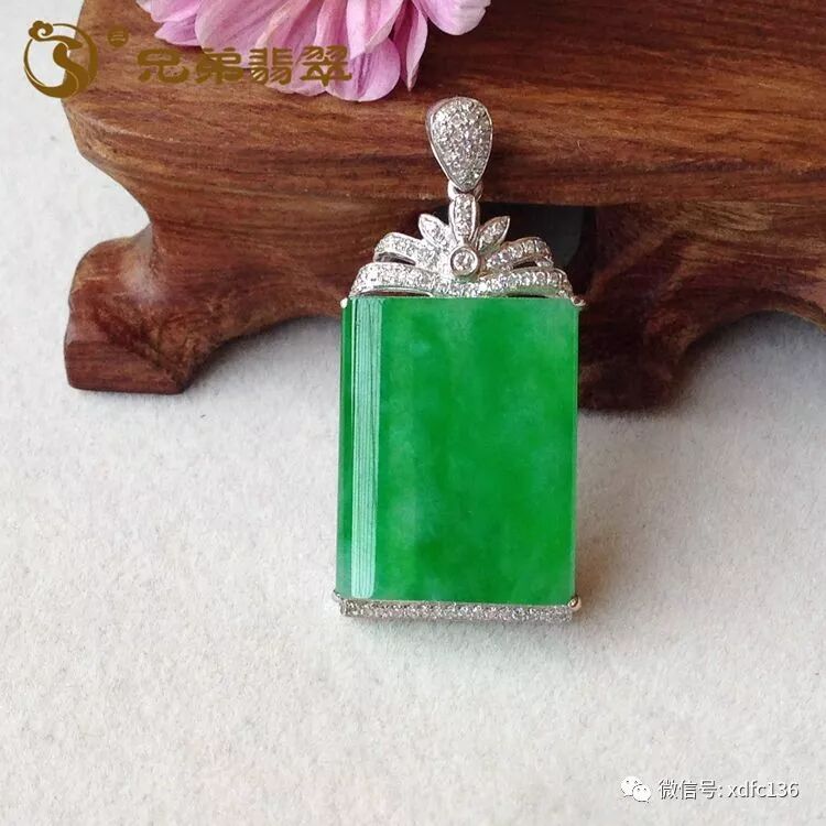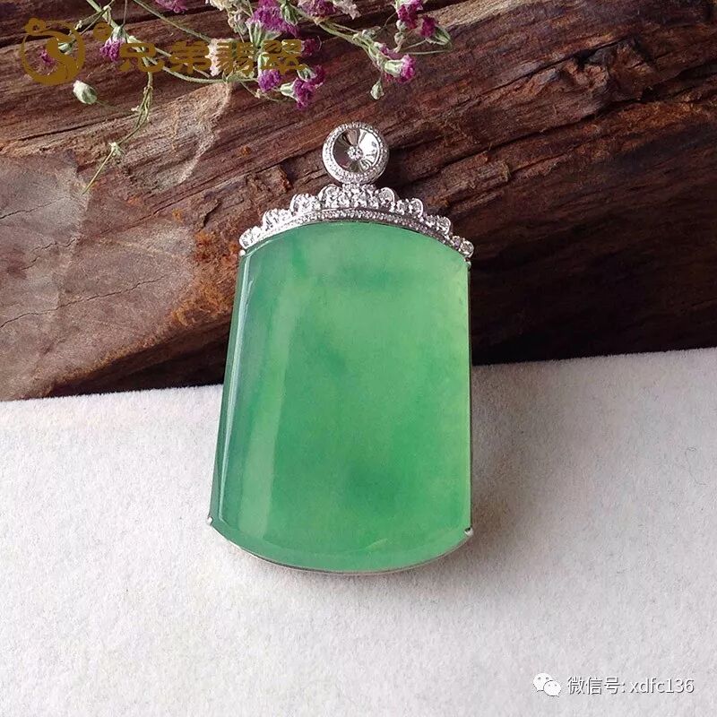 编号59672老坑高冰起光阳绿底无事牌吊坠18K金伴钻(价2.68W)规格:裸石37.9*27.8*3.6mm 连金51.2*28.9*8mm/18.4g 有斜纹 无抠感 老坑高冰料,底子通透有光泽!满阳色,很冰翠!大件厚装,款式简约时尚!佩戴起来很大气!保事事顺利!