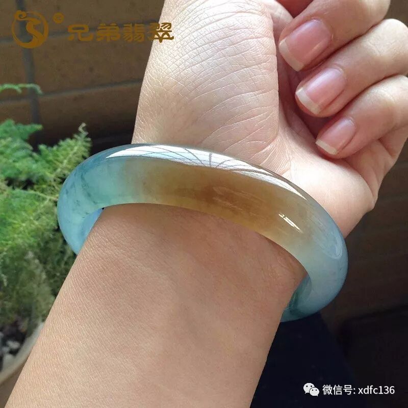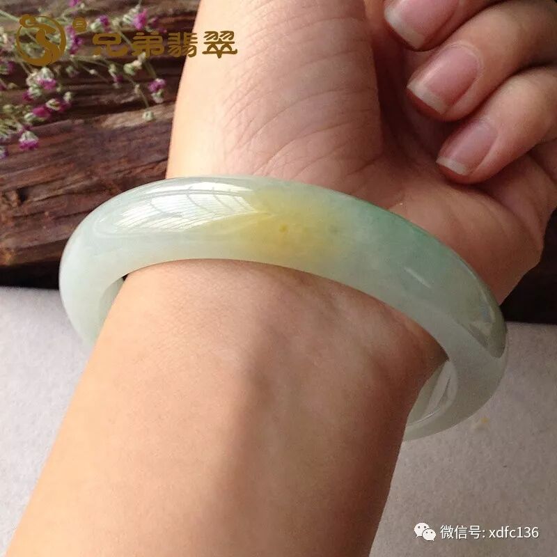 编号59659老坑高冰起胶起光底色飘花一截黄翡特色正装手镯(价6.5W)口径:56.8*13.7*7.5mm/59.4g 无纹裂 老坑高冰种,水头不错,起荧光,胶感十足,清新的底色,飘花缥缈点缀,韵味动人!一抹黄翡点缀,更加招财!上手气质爆棚!行家货~佩戴滋养一下更漂亮!