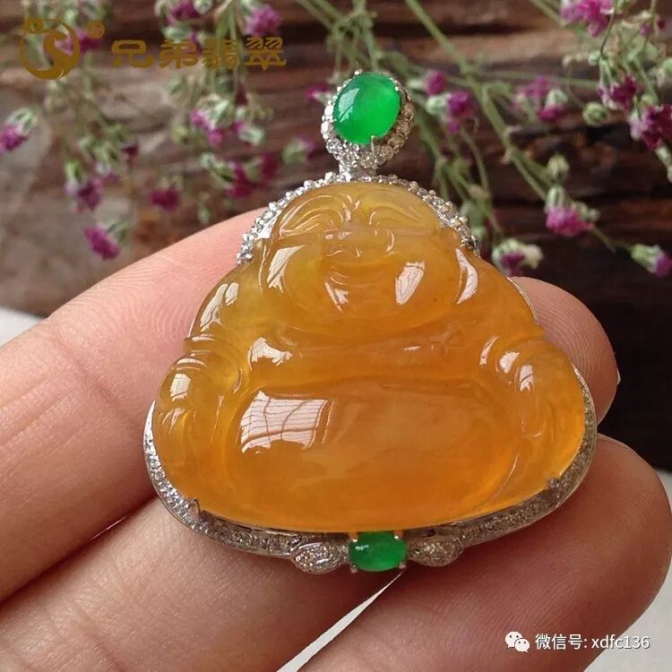 编号R1628满黄翡佛公吊坠18K金伴钻秒杀款(价1.68W)规格:大裸石22.8*27.4*2.8mm 小裸石5.2*4*1mm 连金34.8*29.6*9.7mm/11.2g 无纹裂