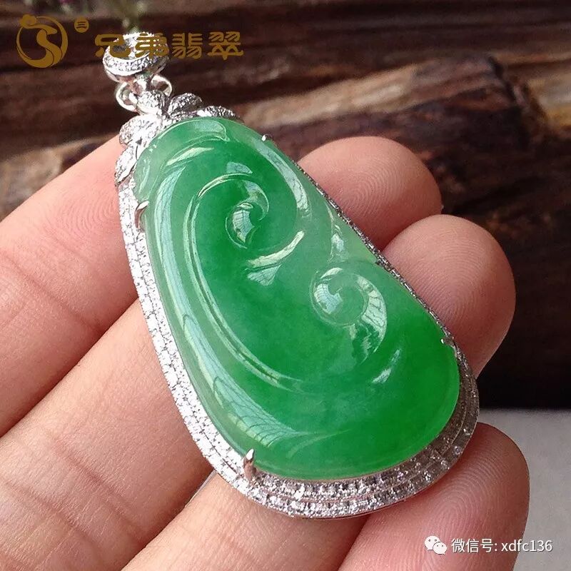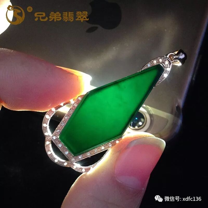 编号59640老坑冰绿如意吊坠18k金伴钻(价1.45W)规格:裸石34.4*18.3*4mm 连金48.3*21.5*8.5mm/9.9g 无纹裂 老坑种,底子细腻,水润润,鲜鲜的绿意,清爽袭人,18K金伴钻镶嵌,上身青春活力!喜欢的赶紧~~~