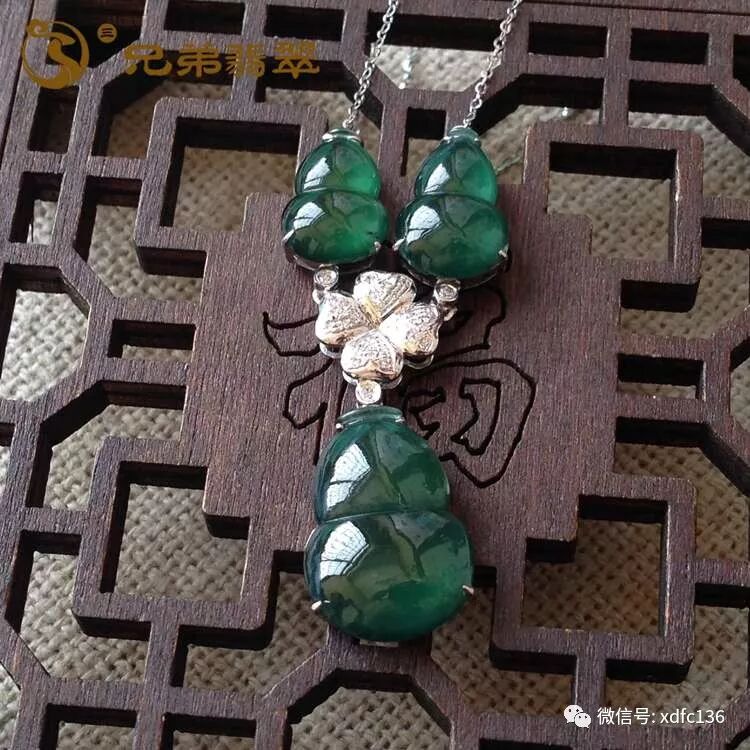 编号E2031深阳绿葫芦项链18K金伴钻秒杀款(价3600)规格:大裸石17.5*11.9*1.3mm 连金17.5*11.9*5.7mm 小裸石11.9*8.3*1.5mm 连金11.9*8.3*5.4mm/7.3g 长约40cm 无纹裂