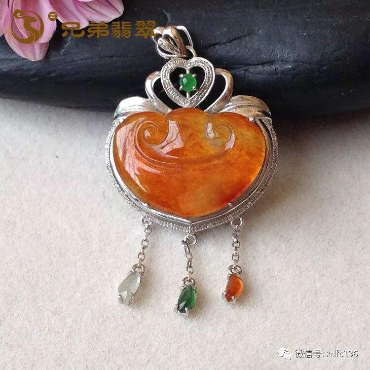 编号R1630阳绿中国结吊坠18K金伴钻秒杀款(价4500)规格:大裸石18.2*17.6*2.4mm 小裸石4.7*1.3mm 连金51.9*24.5*7.6mm/5.3g 无纹裂