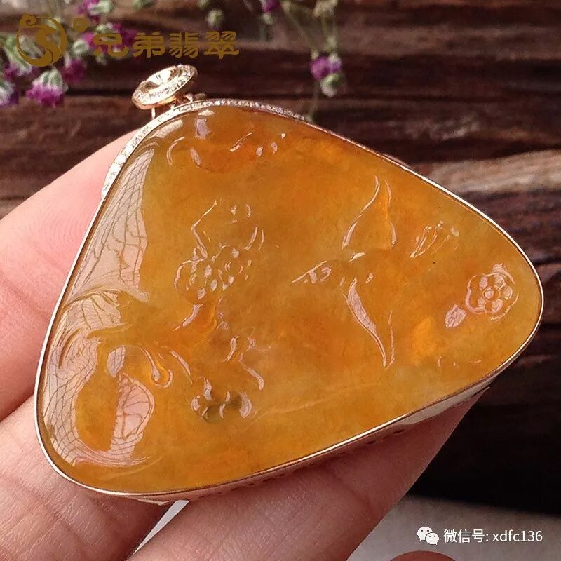 编号59639老坑冰黄翡喜上眉梢吊坠18k金伴钻(价8200)规格:裸石30.7*41.2*3mm 连金40.2*42.3*7.4mm/13.3g 无纹裂 老坑冰种,底子细腻,水头不错,满眼的黄翡色,鲜艳浓郁,火辣辣的色泽,喜上眉梢寓意美好,18k金伴钻镶嵌,上身即惊喜!!