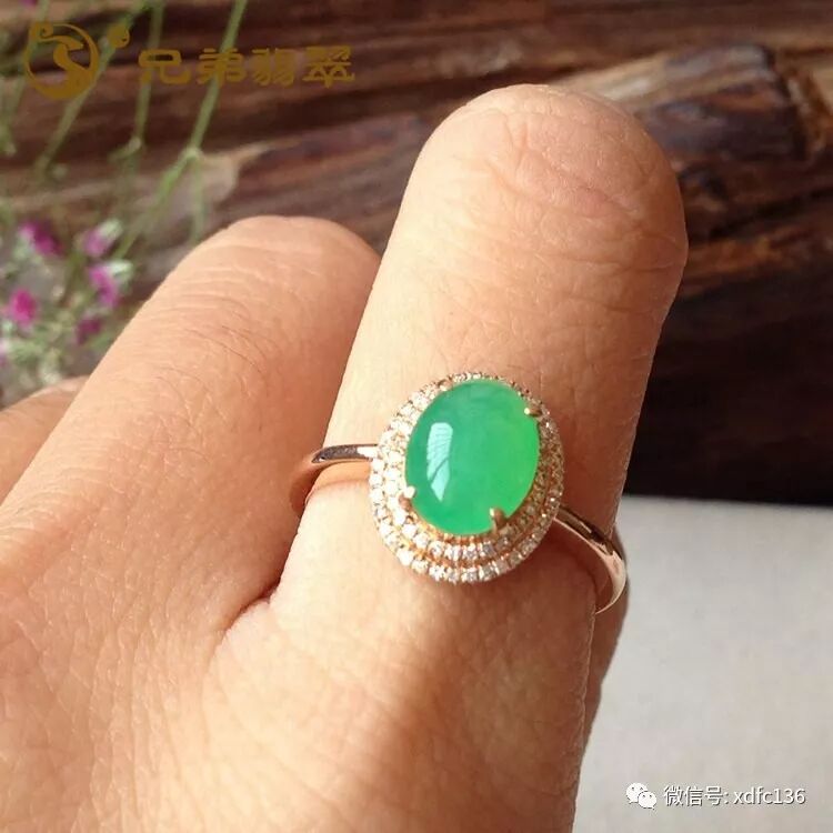 编号R1626冰绿戒指18K金伴钻秒杀款(价2500)规格:裸石5.7*11.6*1mm 连金5.7*11.6*3.8mm/1.9g 圈口13号 无纹裂