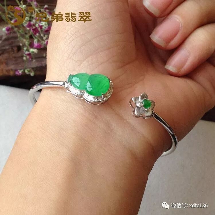 编号R1627阳绿葫芦手镯18K金伴钻秒杀款(价5500)口径:裸石13.6*8.3*1.2mm 连金56.1*44*11*6.4mm/5.3g 无纹裂