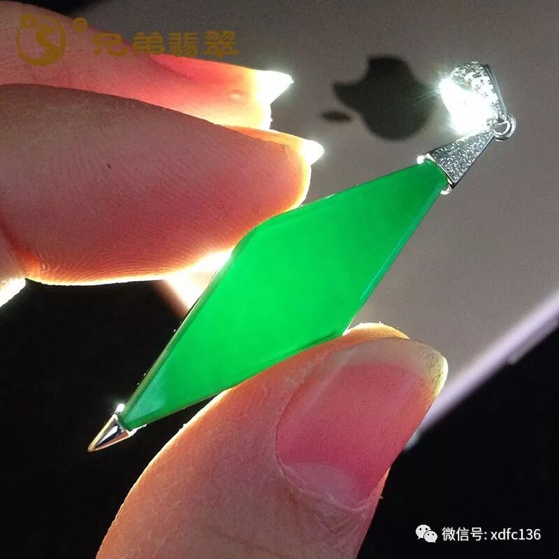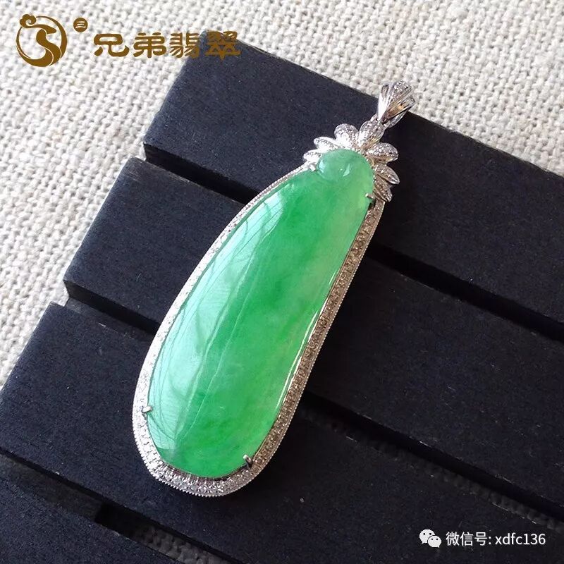 编号59245老坑高冰阳绿福瓜吊坠18K金伴钻(价1.3W)规格:裸石41.3*14.6*3mm 连金56.7*17.7*7.8mm/8.5g 无纹裂 清新的绿色,十分养眼,很耐看!质地冰润,底子细腻,水润润,镶嵌工艺简约时尚,上身即尊贵迷人!福瓜寓意福气绵延,福禄双全!