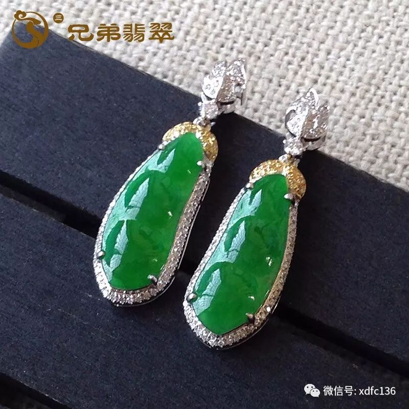 编号59244老坑阳绿福豆耳坠18K金伴钻(价1.33W)规格:裸石19.1*7.5*3mm 连金31.4*9.3*5.6mm/2.5g 另一个差不多 两个共重4.9g 一个无纹裂 另一个有细纹 无抠感 种老色美,色泽均匀,阳绿色色浓骄艳,吸睛夺目,镶嵌工艺简约时尚,福豆耳坠,精美高贵,性价比摆在这,懂的入~