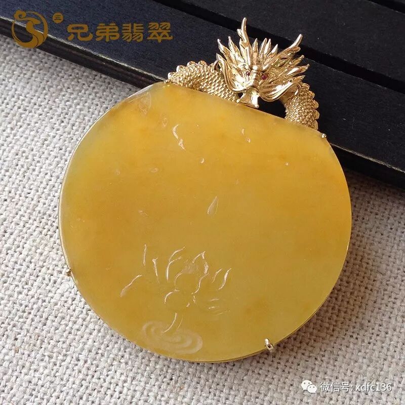 编号59249老坑手镯心细底贵族黄均匀色莲花特色吊坠18K金伴钻(价2.3W)规格:裸石49.5*53.7*3.5mm 连金65.3*53.9*8.4mm/41.2g 无纹裂 老坑手镯心起货,质地均匀,底子细腻,水润润,鲜丽的黄翡色,很娇艳,雕工精致,莲花很精美,18K金钻特色镶嵌,上身别致一番风味~料子大件,很有存在感!