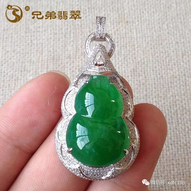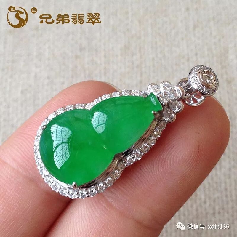 编号59251老坑饱满冰艳阳绿特色葫芦吊坠18K金伴钻(价4.4W)规格:裸石24*16.9*6.5mm 连金47.3*23.2*13.4mm/12.3g 有纹 无抠感 浓艳高贵的艳阳色,种色可谓相当出色!质地均匀,底子细腻,有质感,葫芦圆润饱满可人,18K金镶嵌伴钻,贵族范儿,上身贵气逼人!