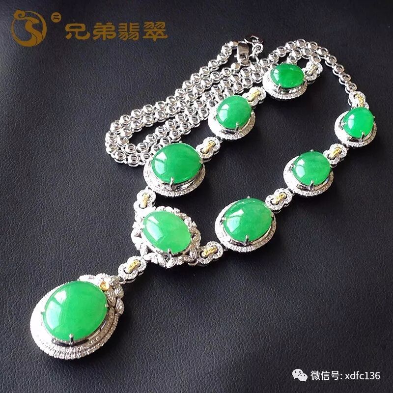 编号59280老坑冰绿饱满锁骨项链18K金(价6.3W)规格:大裸石15.3*12.5*2.6mm 连金23.9*17.9*10mm 小裸石9.1*7.8*1.5mm 连金12.4*11.2*8.3mm 8颗重36.6g 长约45cm 有纹 无抠感 种色水俱佳的项链,蛋面颗颗饱满圆润,很有质感!满阳色,鲜艳浓郁,很高品!蛋面大小匀称,镶嵌款式精巧,佩戴上身大气时尚,富贵有余~~