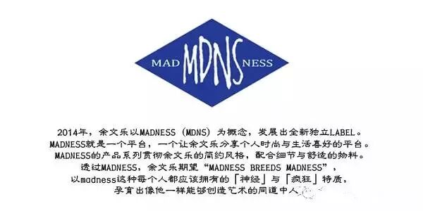 2014年;余文乐以MADNESS[MDNS]为概念,发展出全新独立LABEL。MADNESS就是一个平台,一个让余文乐分享个人时尚与生活喜好的平台。MADNESS的产品系列贯彻余文乐的简约风格,配合细节与舒适的物料。透过MADNESS,余文乐期望‘ MADNESS BREEDS MADNESS'以madness这种每个人都应该拥有的[神经]与[疯狂]特质。孕育出像他一样能够创造艺术的通道中人。