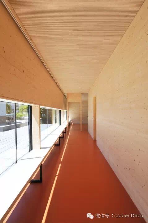 整个建筑计划采用厚木结构。这不仅有利于提高建筑的物理特性,而且也可以事先制作,从而可以缩短工期。内部的天花和墙壁均采用木材装修。