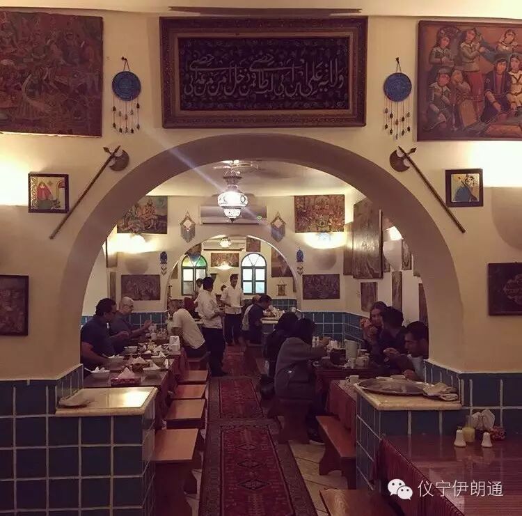 蓝色的瓷砖象征着水元素与纯净,白色的墙壁上悬挂着伊朗神话传说故事的插图。在这样古朴的氛围里来一份香浓的dizi,一杯氤氲着水汽的波斯红茶,和甜甜的伊朗茶点,耳畔伴着说书人浑厚嗓音弹唱的史诗《列王记》,这样的惬意生活,恐怕就连古代的诗人和贤者也会羡慕你。