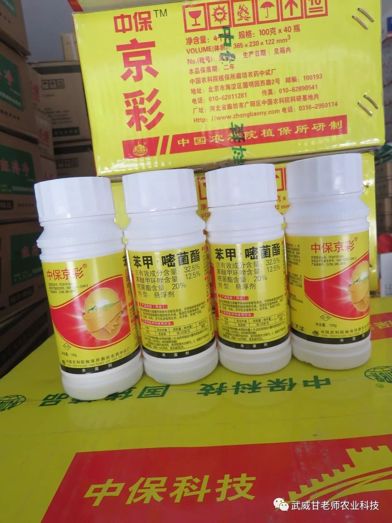 处方2:32.5%%京彩(苯甲·嘧菌酯)悬浮剂20克+43%翠富(戊唑醇)悬浮剂20毫升+钙尔美20克、或兴农盖美25毫升,对15公斤水全田均匀喷雾。