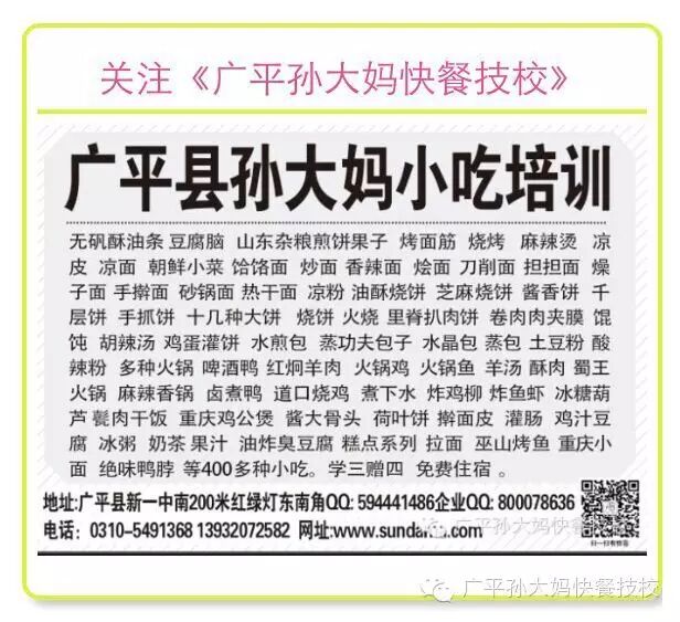 点击”孙大妈餐饮服务中心“更多火爆小吃项目请点击查看详情:砂锅羊肉 腊汁白吉馍 土耳其烤肉 火锅鱼 铁板烧 羊汤 裹皮 冒菜 水饺 麻辣拌 重庆火锅 板面 精品凉拌菜 【新品推出】锅盔培训 蛋挞烧饼 饼卷肉 特色酱大骨培训 卤煮驴肉 酱牛肉 炸鸡翅 掉渣饼【新品推出】台湾脆皮玉米培训 卤煮下水培训 【特色驴肉火烧培训 炸酱面培训 特色老面馒头培训 烧烤培训 淮南牛肉汤培训 烧饼培训 健康无矾油条培训 早点培训 特色烤面筋培训 特色肉/素馅大包培训 砂锅系列培训 特色烤面筋培训 凉菜培训 羊汤 肉/素炒面培训 排骨面培训 担担面培训 酸辣面培训 [ 新品推出]--香辣蟹煲培训 学员点赞 绝味鸭脖 拉面培训 冒菜 披萨 干锅系列 生煎包培训 武大郎烧饼培训 特色早点 烤冷面 学校学习环境 旋转小火锅 蒸功夫包子 老北京芝麻烧饼 桂林米粉 串串香 麻辣香锅等等400多项小吃技术 咨询热线:13932072582 0310-5491368