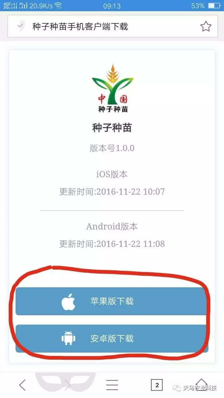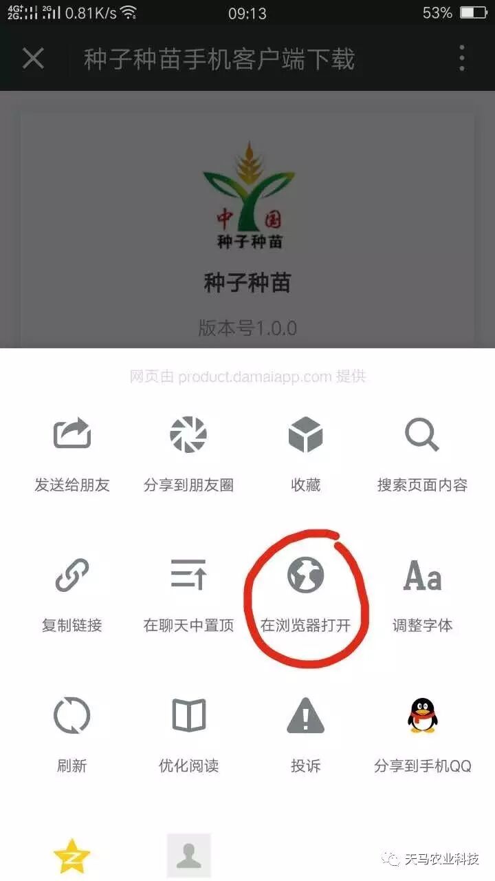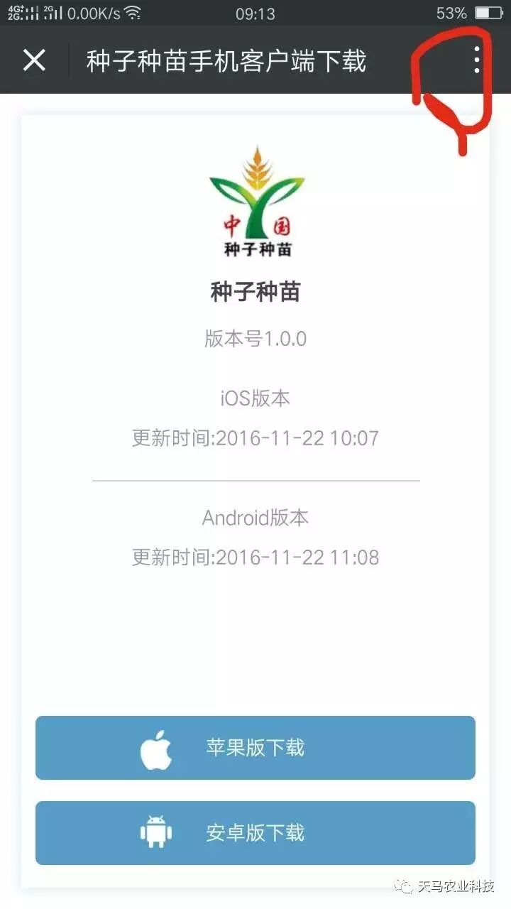 扫描二维码点击右上,从浏览器打开,下载安装官方APP截图,发送到公众号,本公司赠送价值50元天马种子购物券一张!