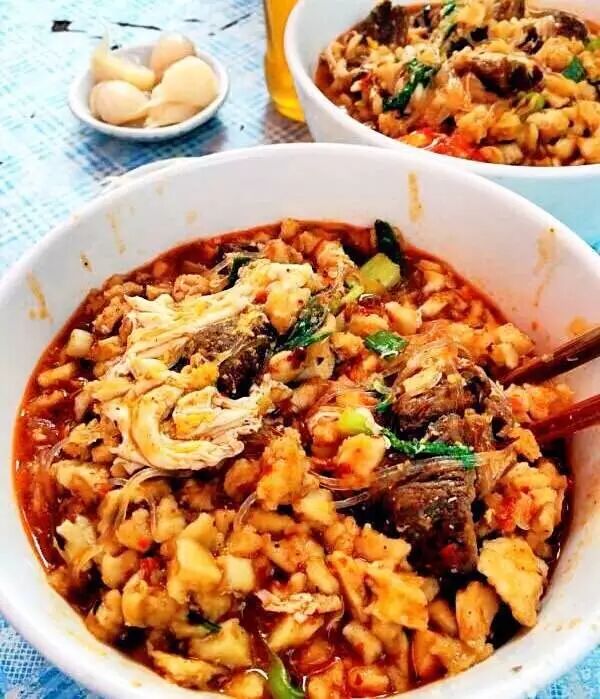 第四,干刨和水围城的抉择。泡馍一般分两种,干刨和水围城,一种汤,一种干。我个人喜欢干刨,汤不是没有,而是被吸收到了掰的很小的馍里,这样比直接喝汤还要鲜美,回味悠长。