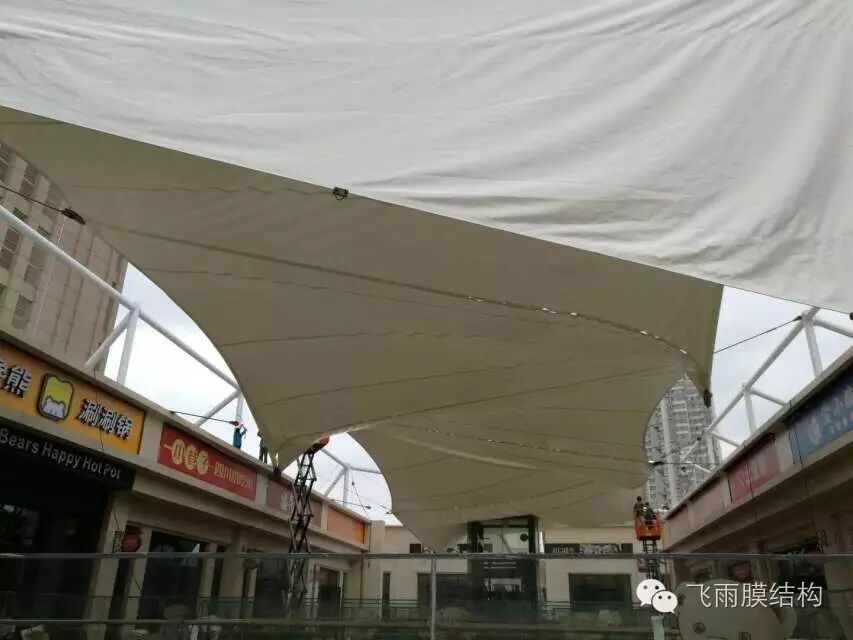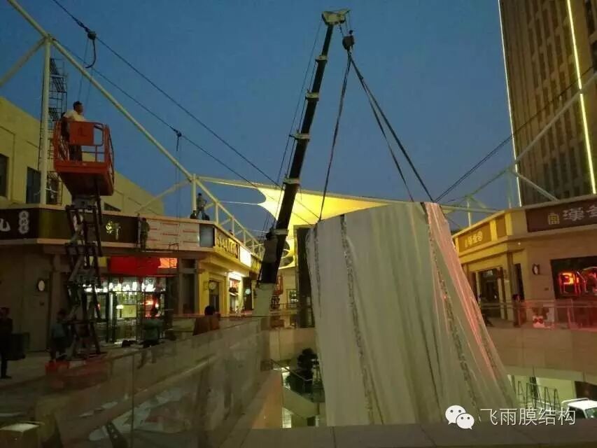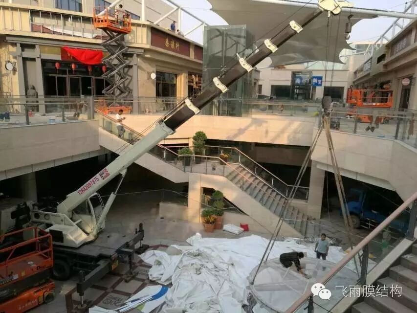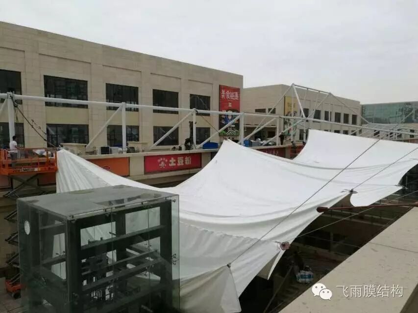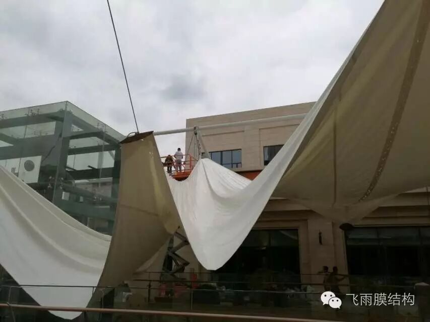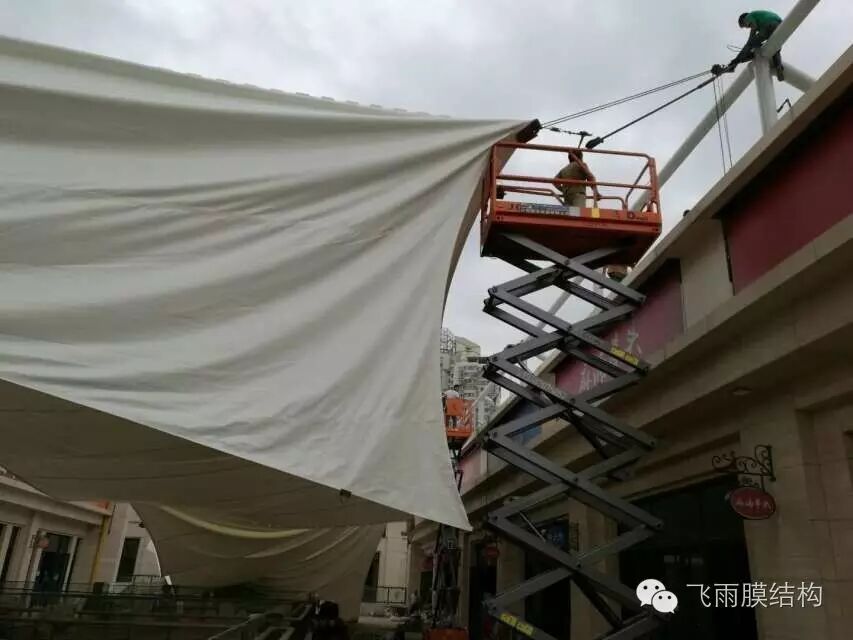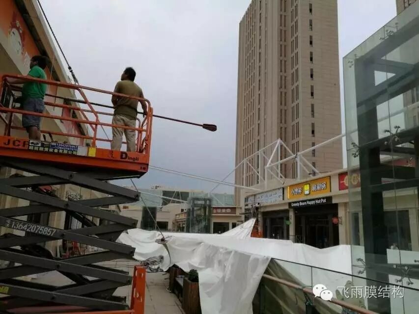 一直以来本着以质量求生存,以诚信求发展的理念承接每一个项目,结交每一个客户朋友。这次天津福地广场商业街张拉膜项目在施工的过程以及现场的条件每一个环节对我们都是一种挑战,现场的布局是不可以破环一个角落。本工程为典型的索拉悬挑结构,属于骨架式膜结构的范畴。膜结构安装的主要构件有支撑杆件、膜压板、膜接点板、拉索、膜材固定等。我们在通知进场前就最好前期的一切工作,根据工程设计做好项目划分承包,编制施工组织设计和施工网络,作好施工过程和内外协调工作,对工程款统一平衡,合理分配,组织好主要材料的供应和设备管理工作。统一组织、指挥该工程,按照与业主签订的合同,确保工期、质量。按照公司要求,安全、物耗、文明施工和降低成本达到规定目标,直至工程验收合格。