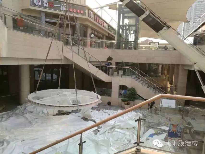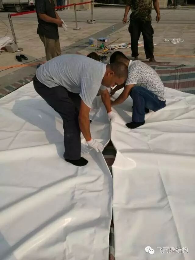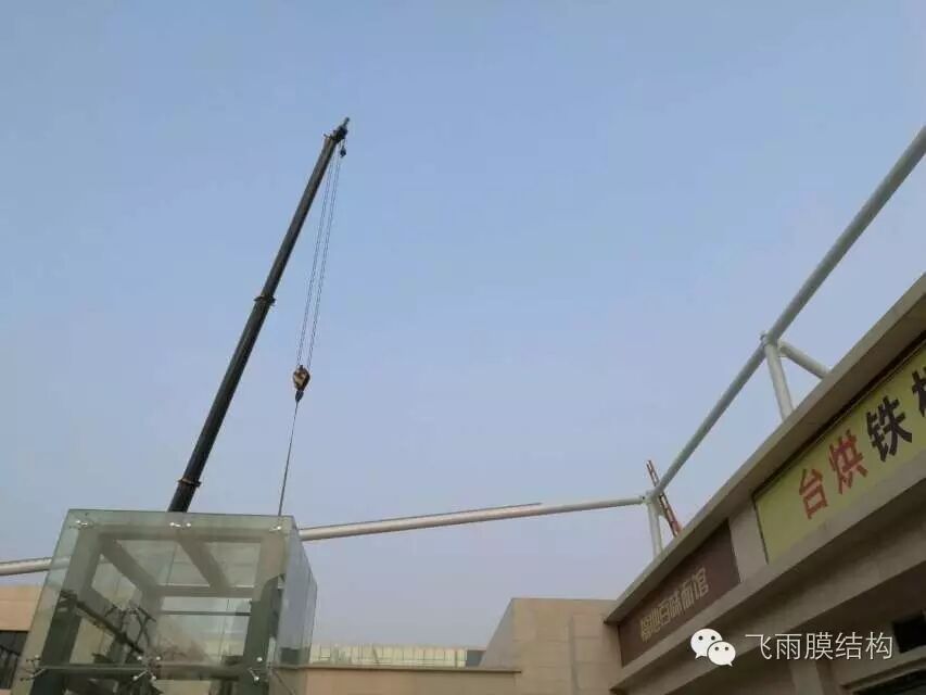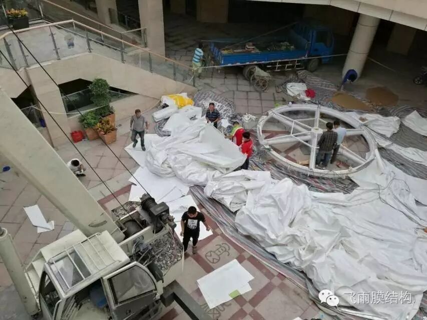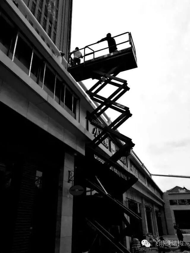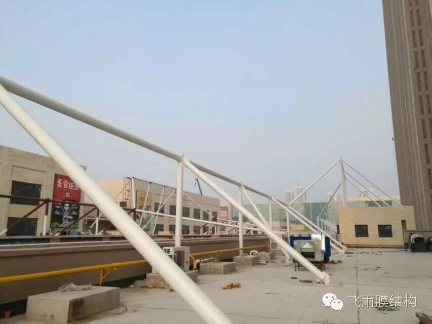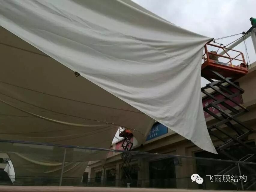 一直以来本着以质量求生存,以诚信求发展的理念承接每一个项目,结交每一个客户朋友。这次天津福地广场商业街张拉膜项目在施工的过程以及现场的条件每一个环节对我们都是一种挑战,现场的布局是不可以破环一个角落。本工程为典型的索拉悬挑结构,属于骨架式膜结构的范畴。膜结构安装的主要构件有支撑杆件、膜压板、膜接点板、拉索、膜材固定等。我们在通知进场前就最好前期的一切工作,根据工程设计做好项目划分承包,编制施工组织设计和施工网络,作好施工过程和内外协调工作,对工程款统一平衡,合理分配,组织好主要材料的供应和设备管理工作。统一组织、指挥该工程,按照与业主签订的合同,确保工期、质量。按照公司要求,安全、物耗、文明施工和降低成本达到规定目标,直至工程验收合格。