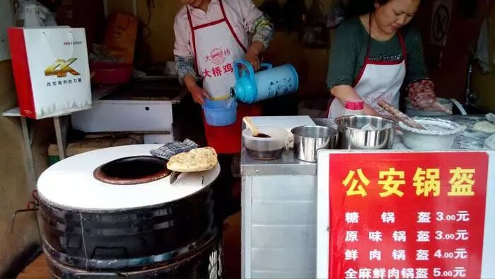 这一切在三两分钟完成,老板再将面饼迅速贴进了炉膛里。大约也不过三两分钟,他用一把专用钳子,轻轻从炉膛里将体积增大近一倍的锅盔取了出来,然后老板娘根据学生们的要求刷上厚厚一层辣椒酱,红红的油辣子看着就让人食欲大增。最后把锅盔对折一下,用一张纸包着递给我们。这时候的锅盔,外焦里嫩,松软适宜,趁着热的时候一口咬下去,满嘴溢香,赞不绝口。
